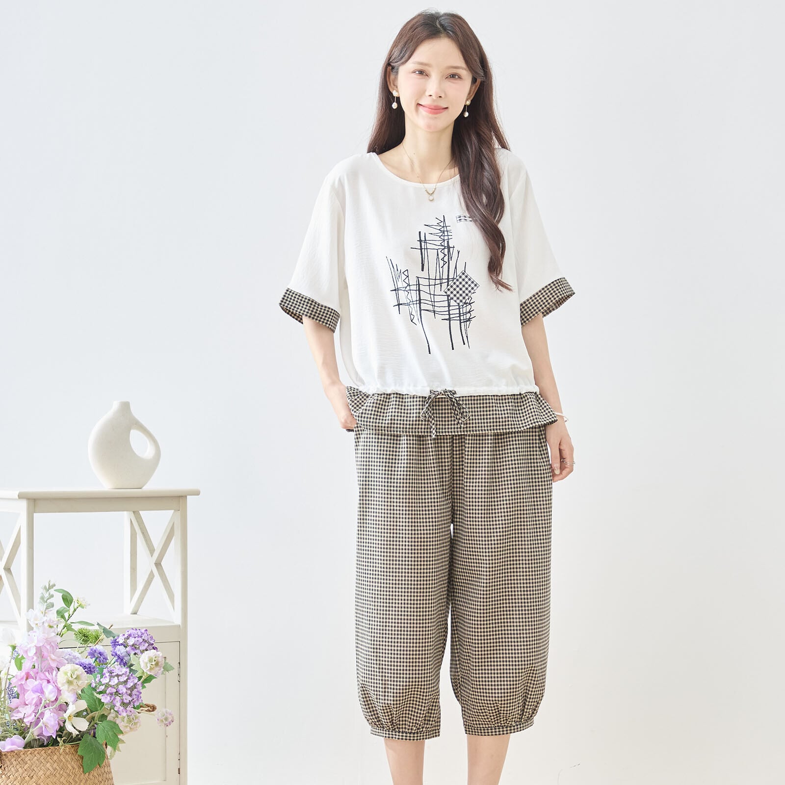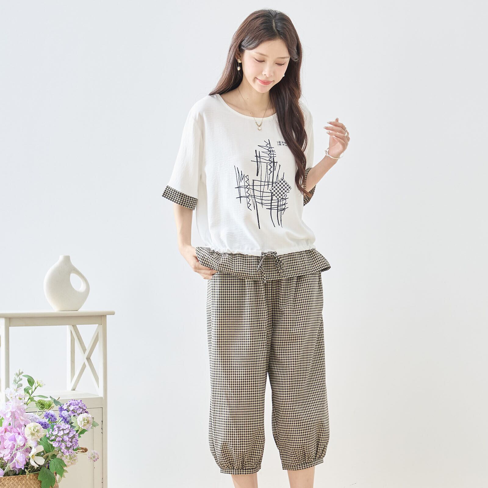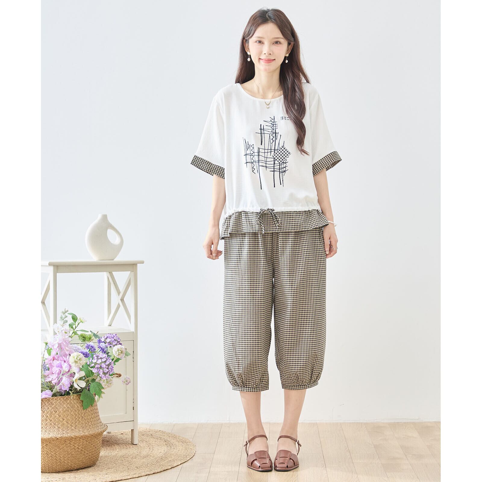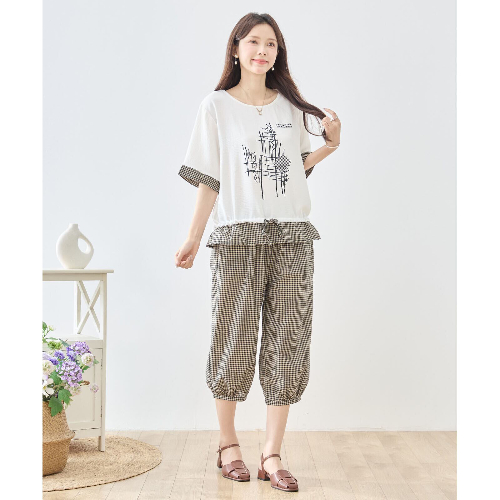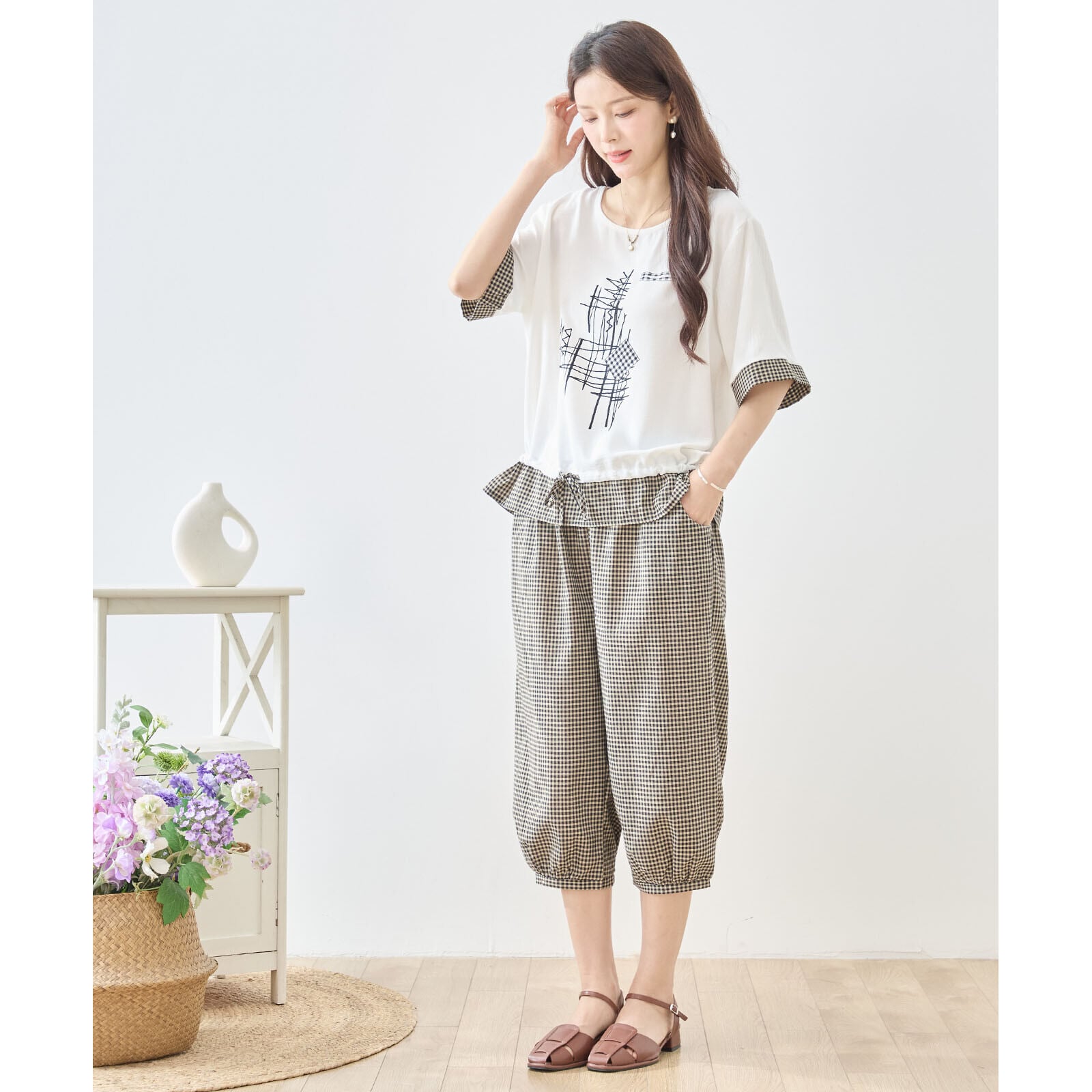 ギンガムチェックのコクーンパンツと、ラインアートプリントのトップスがひとセットになったオシャレな上下セットアップ。
