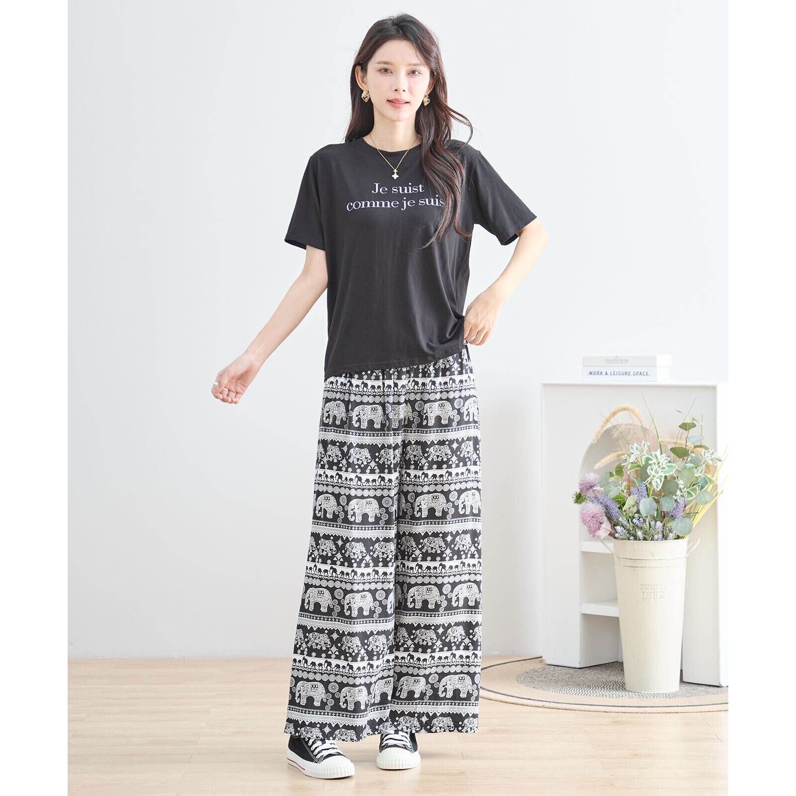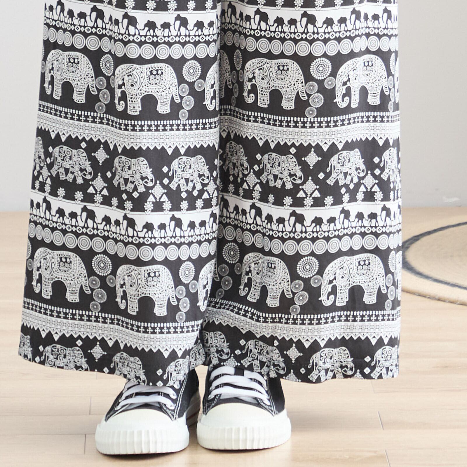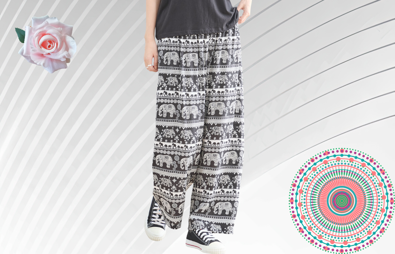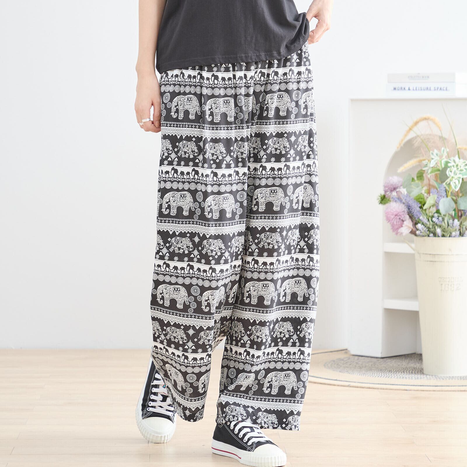 エスニックエレファント柄をあしらった、リラックス感あふれるワイドパンツ。