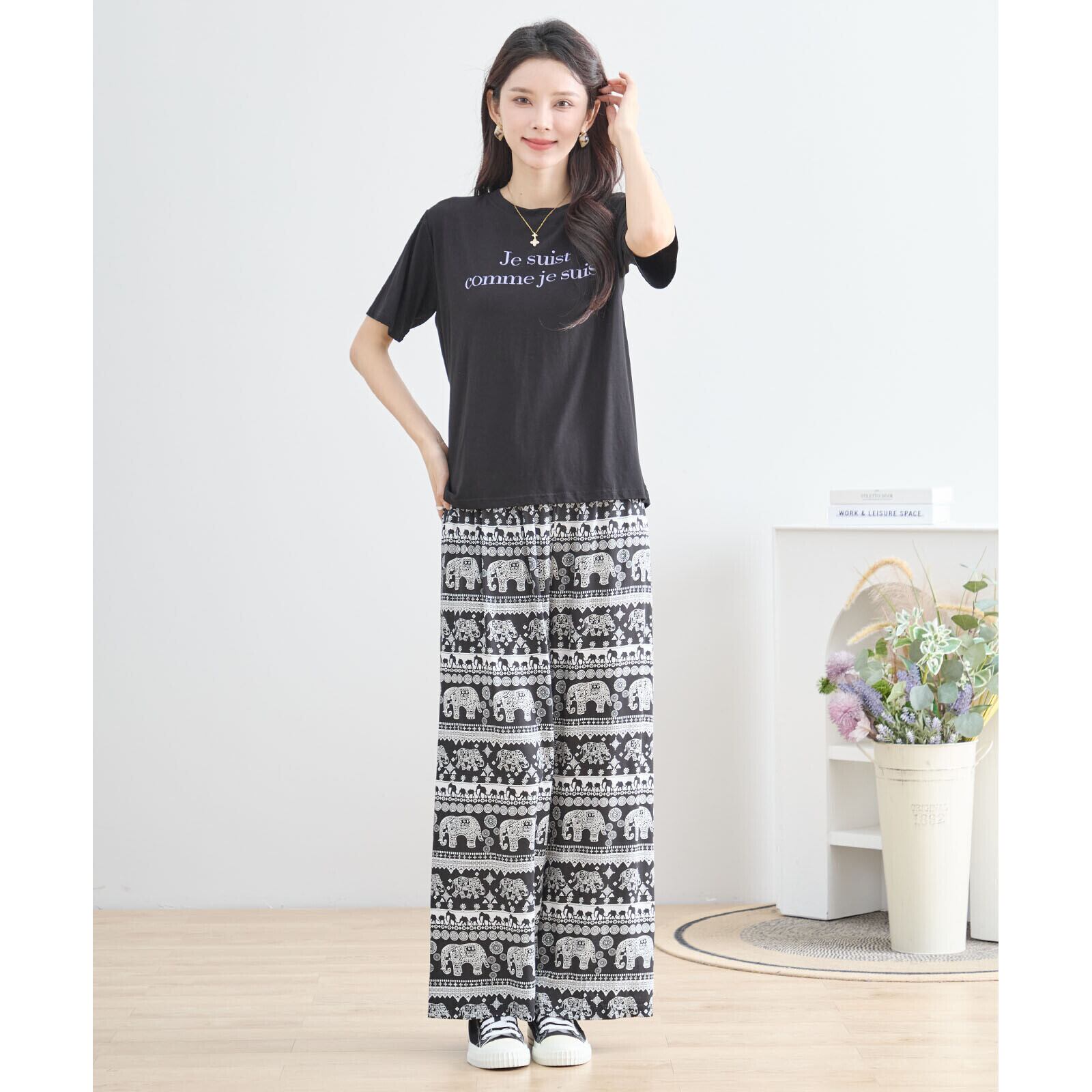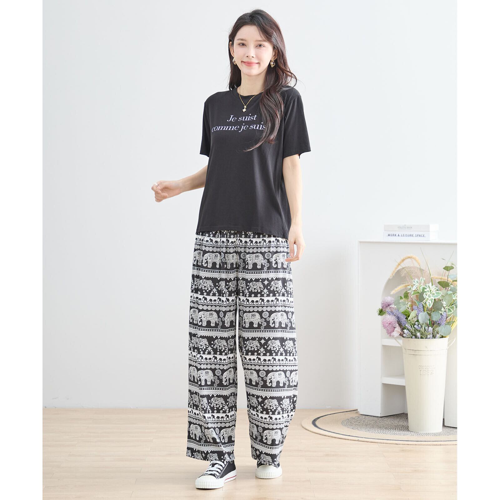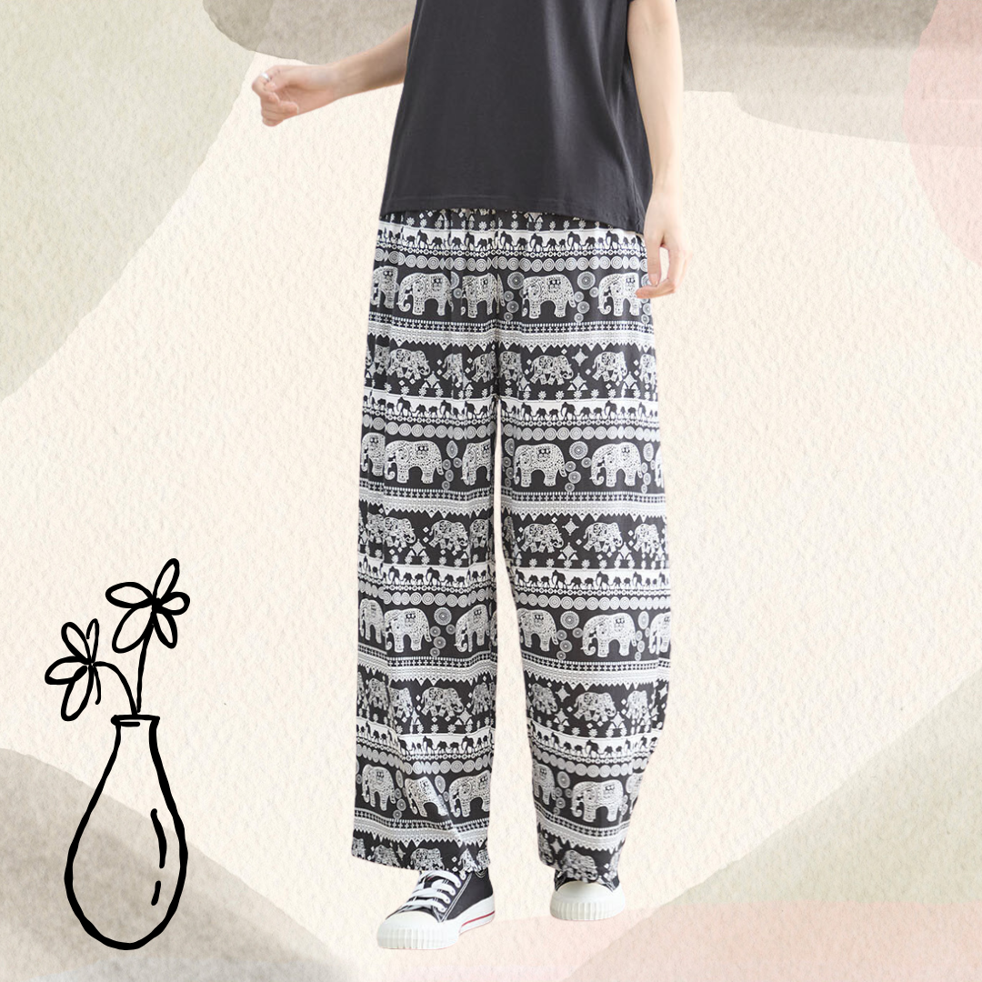 エスニックエレファント柄をあしらった、リラックス感あふれるワイドパンツ。