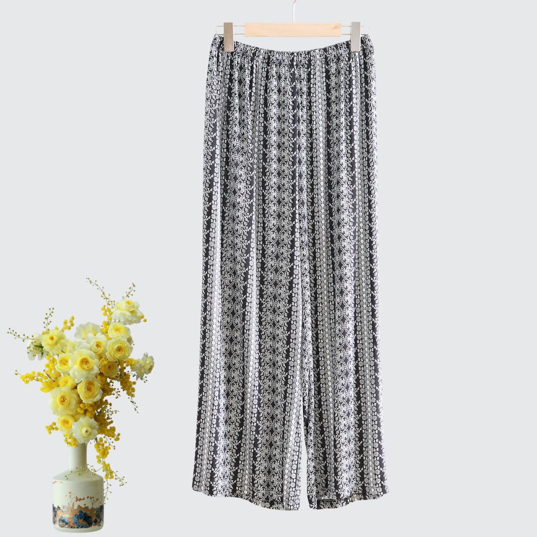 繊細なレース柄風の花柄プリントが印象的なワイドパンツ !