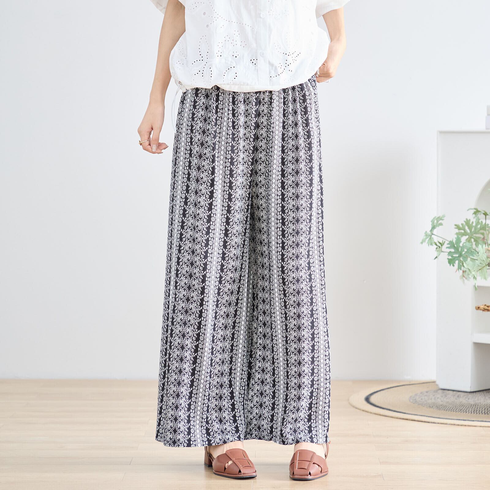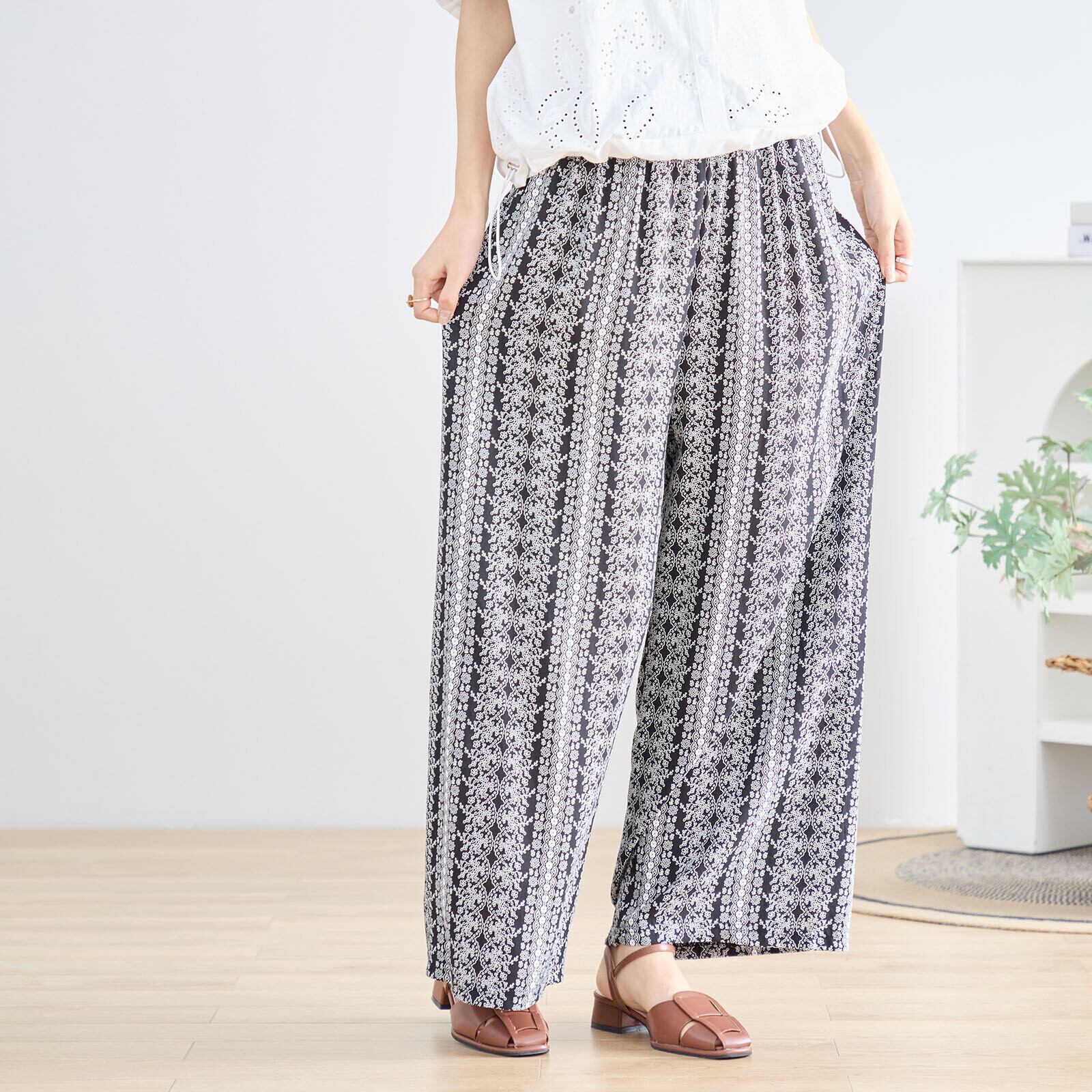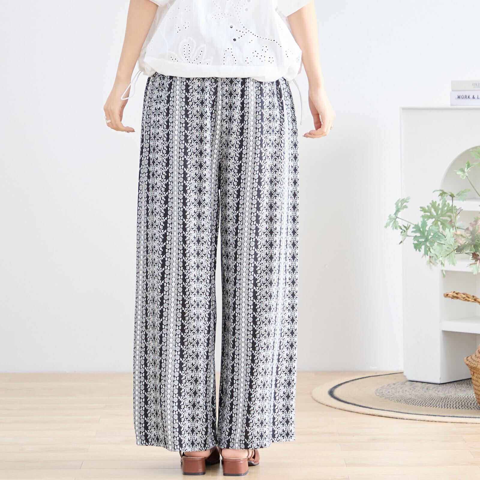 繊細なレース柄風の花柄プリントが印象的なワイドパンツ。