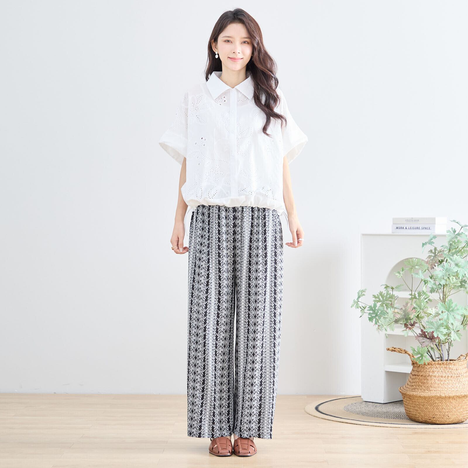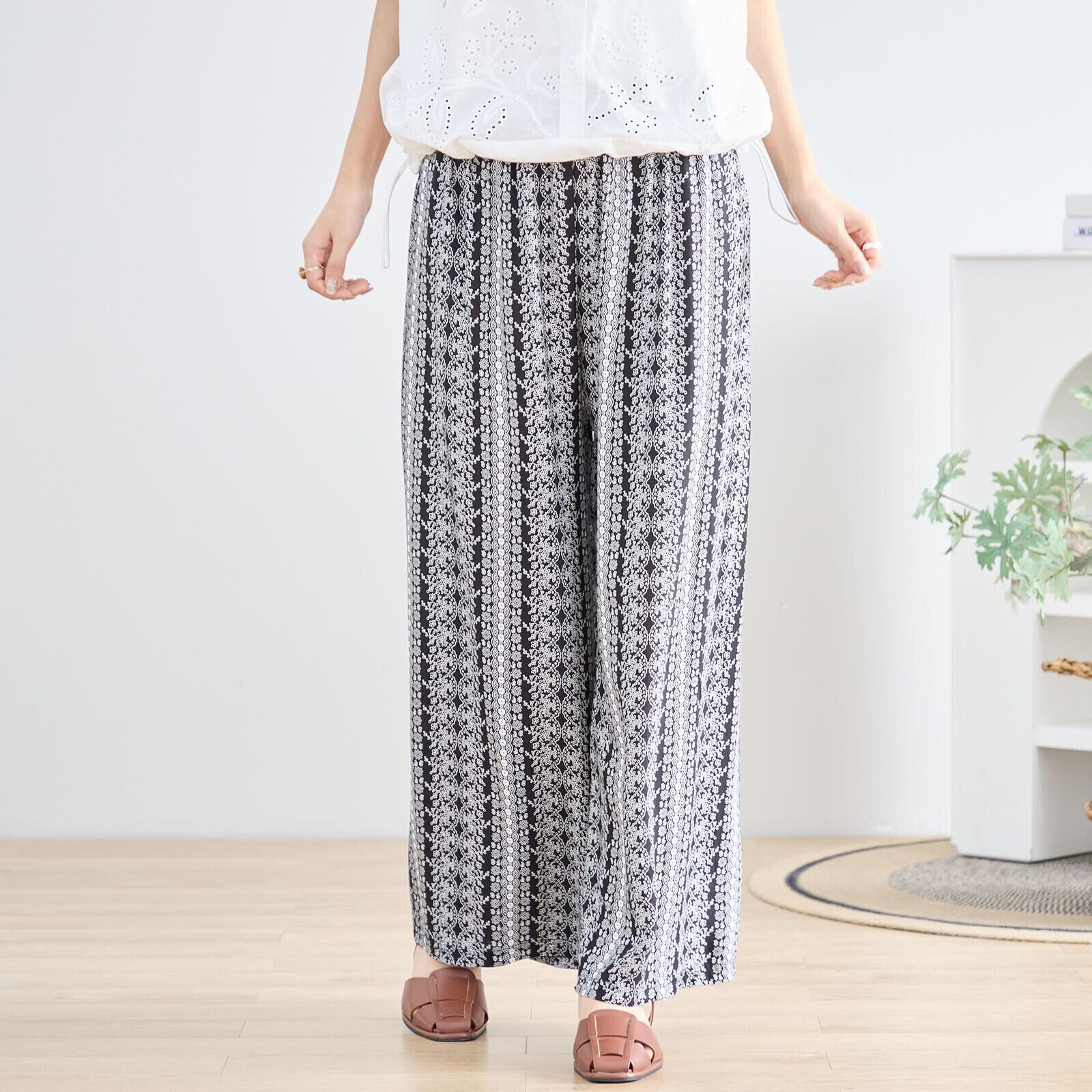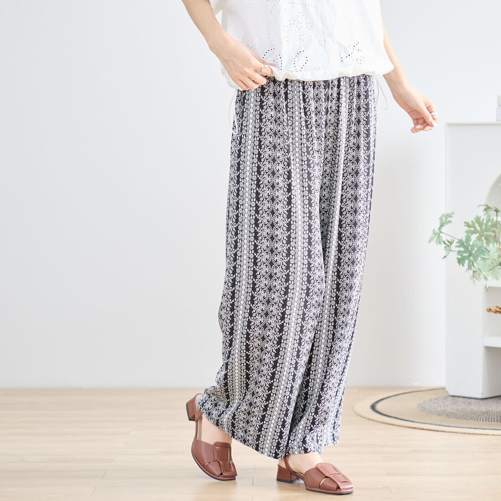 繊細なレース柄風の花柄プリントが印象的なワイドパンツ。