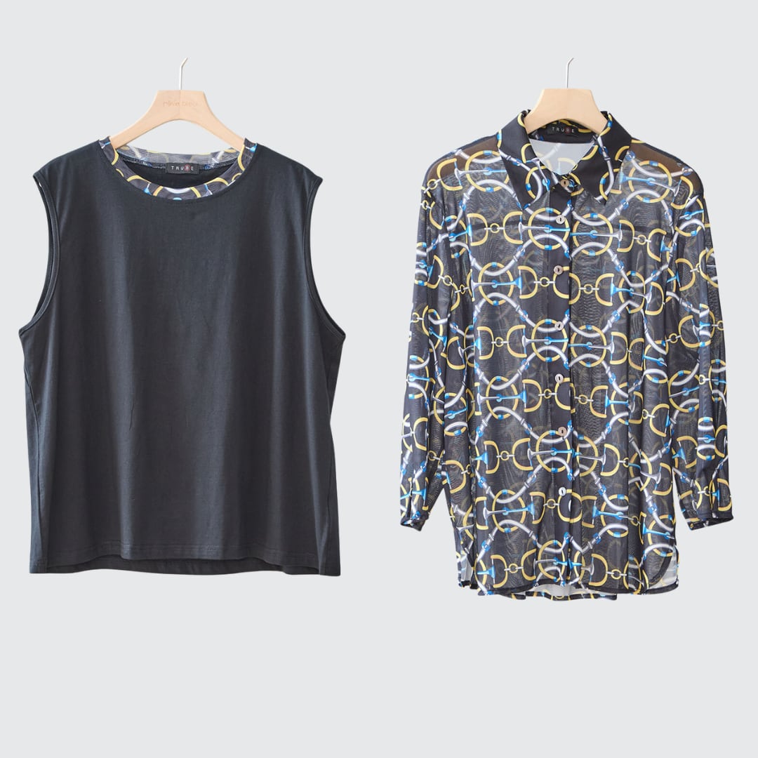 存在感のあるチェーン柄シャツとシンプルなノースリーブトップスの2点セットが登場!