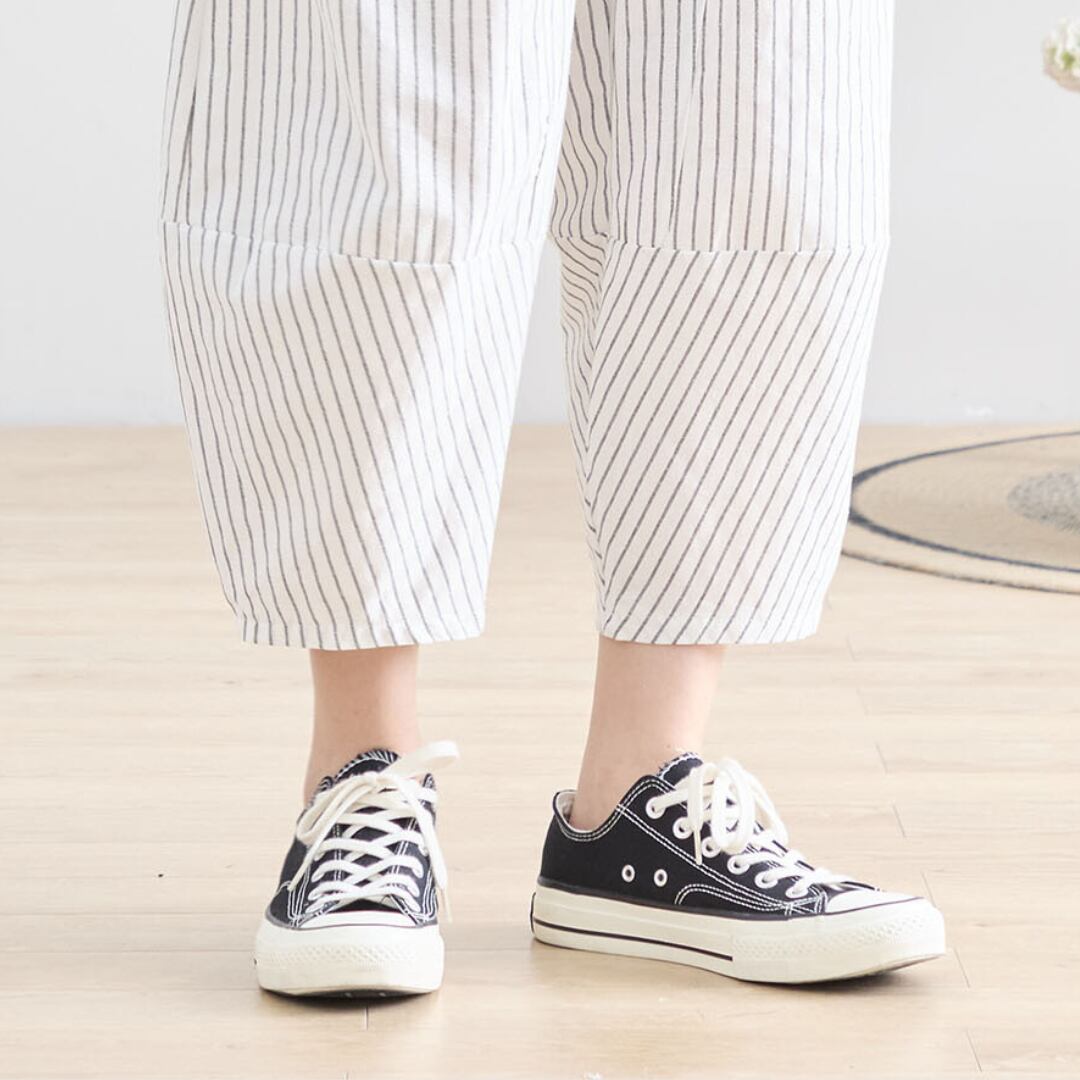 リラックス感のあるデザインは、デイリーコーディネートに自然に溶け込み、さまざまなトップスと相性抜群。ストライプ柄が縦のラインを強調し、スッキリとした印象を与えます。軽やかな素材感は、肌触りも良く、快適な着用感を実現しています。
