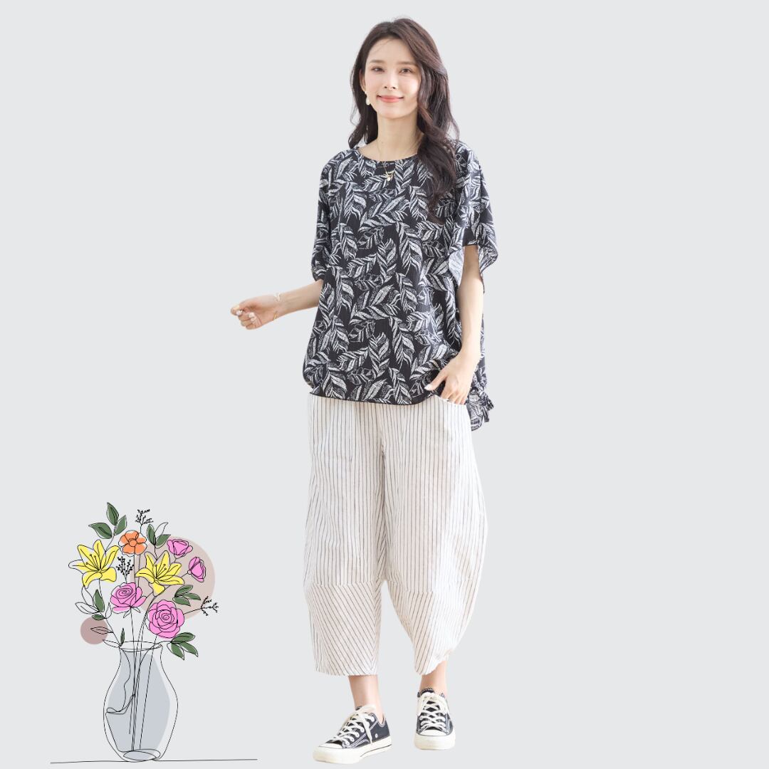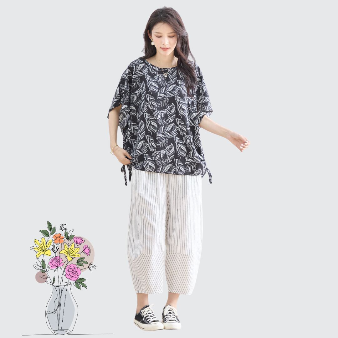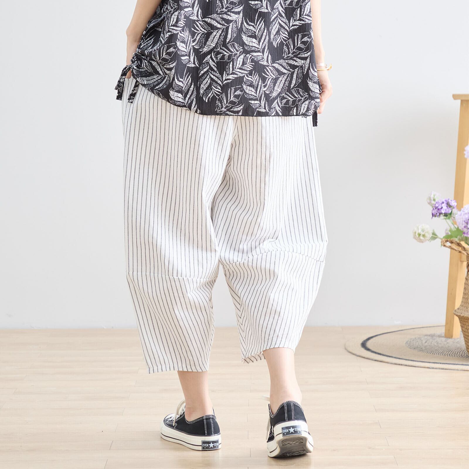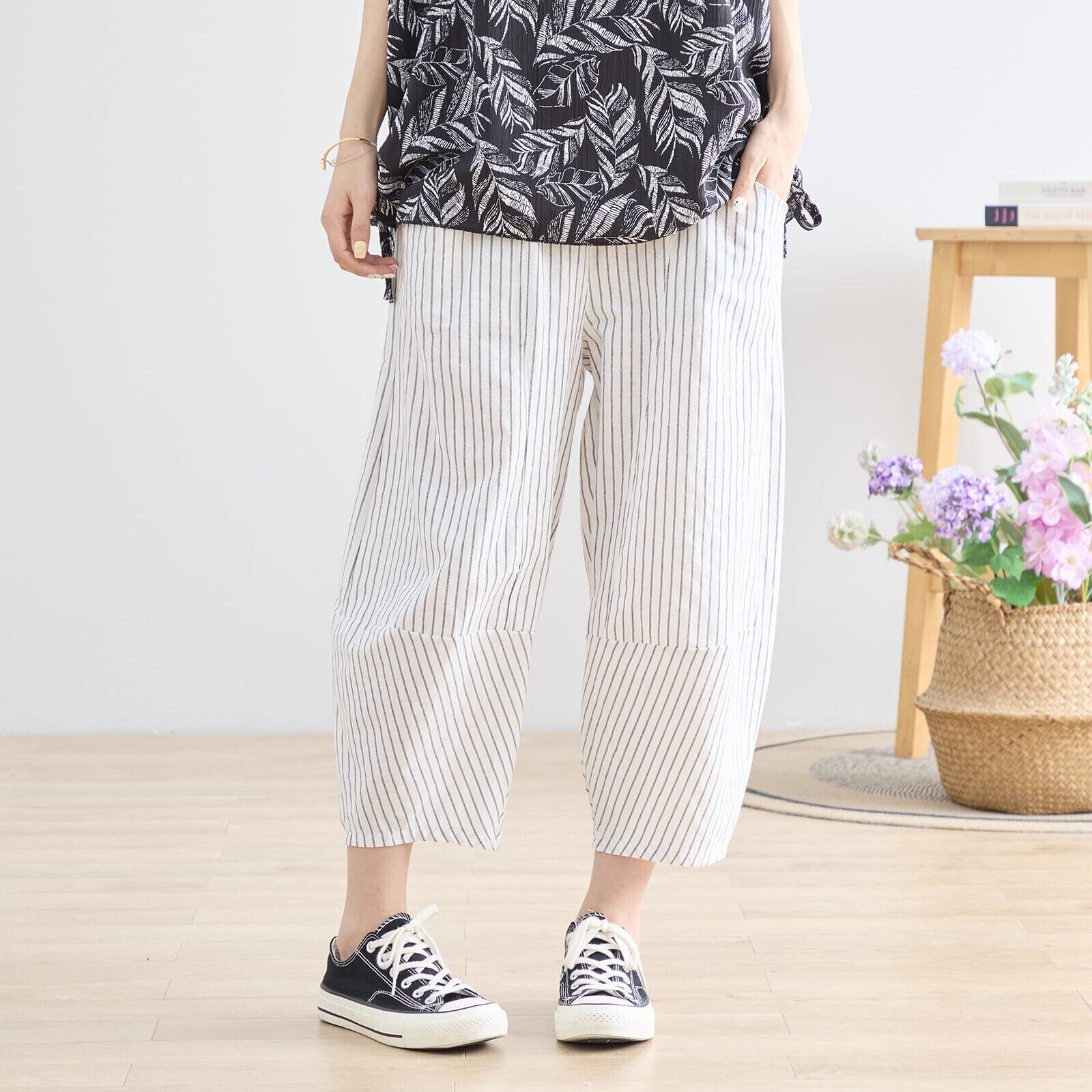 軽やかなストライプ柄とゆったりとしたワイドシルエットが魅力のパンツ !
