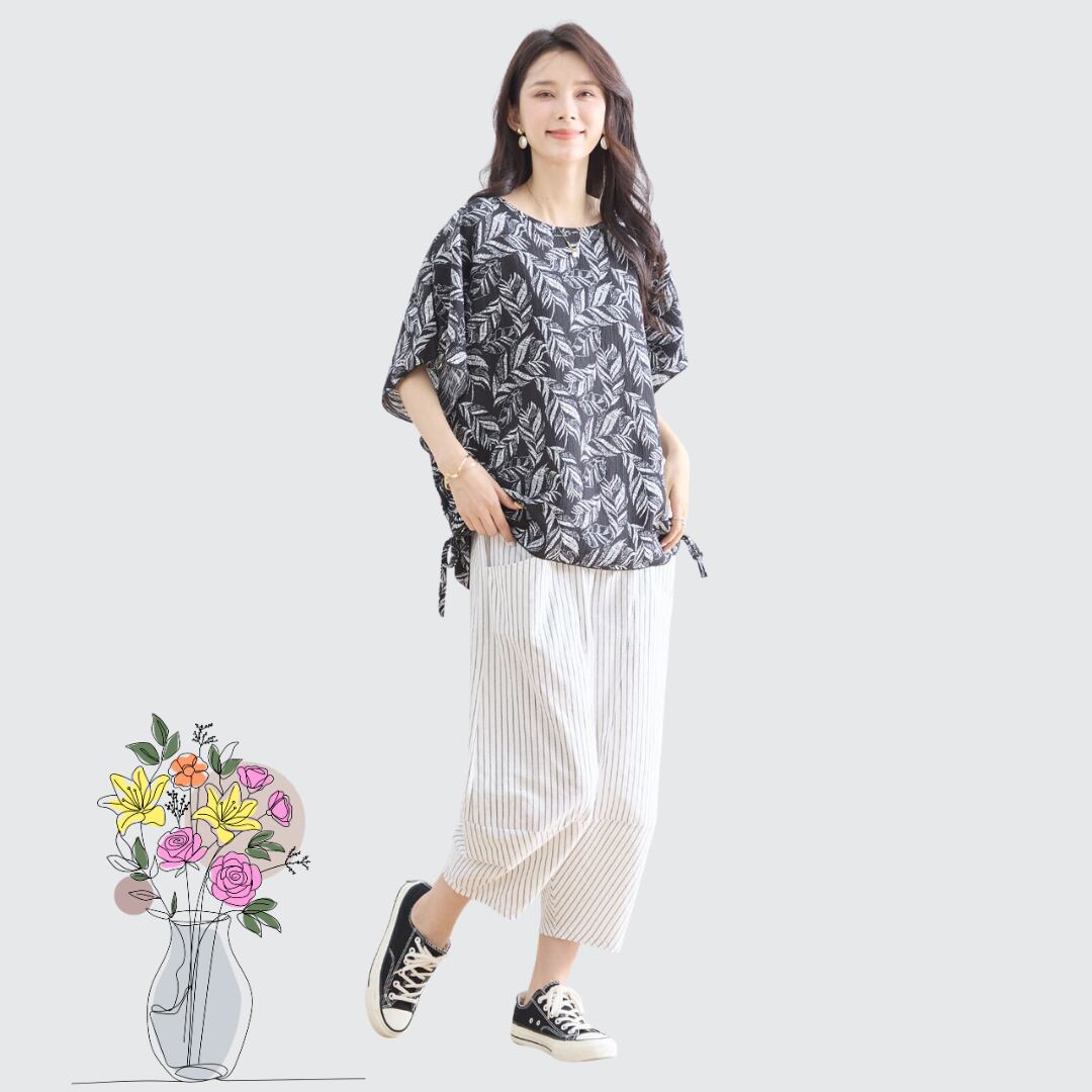 このワイドパンツは、カジュアルからリゾートスタイルまで幅広いシーンで活躍します。部屋着としてはもちろん、お出かけや食事といったシーンでも大活躍することでしょう。あなたのファッションに新しい風を吹き込んでくれること間違いなし!