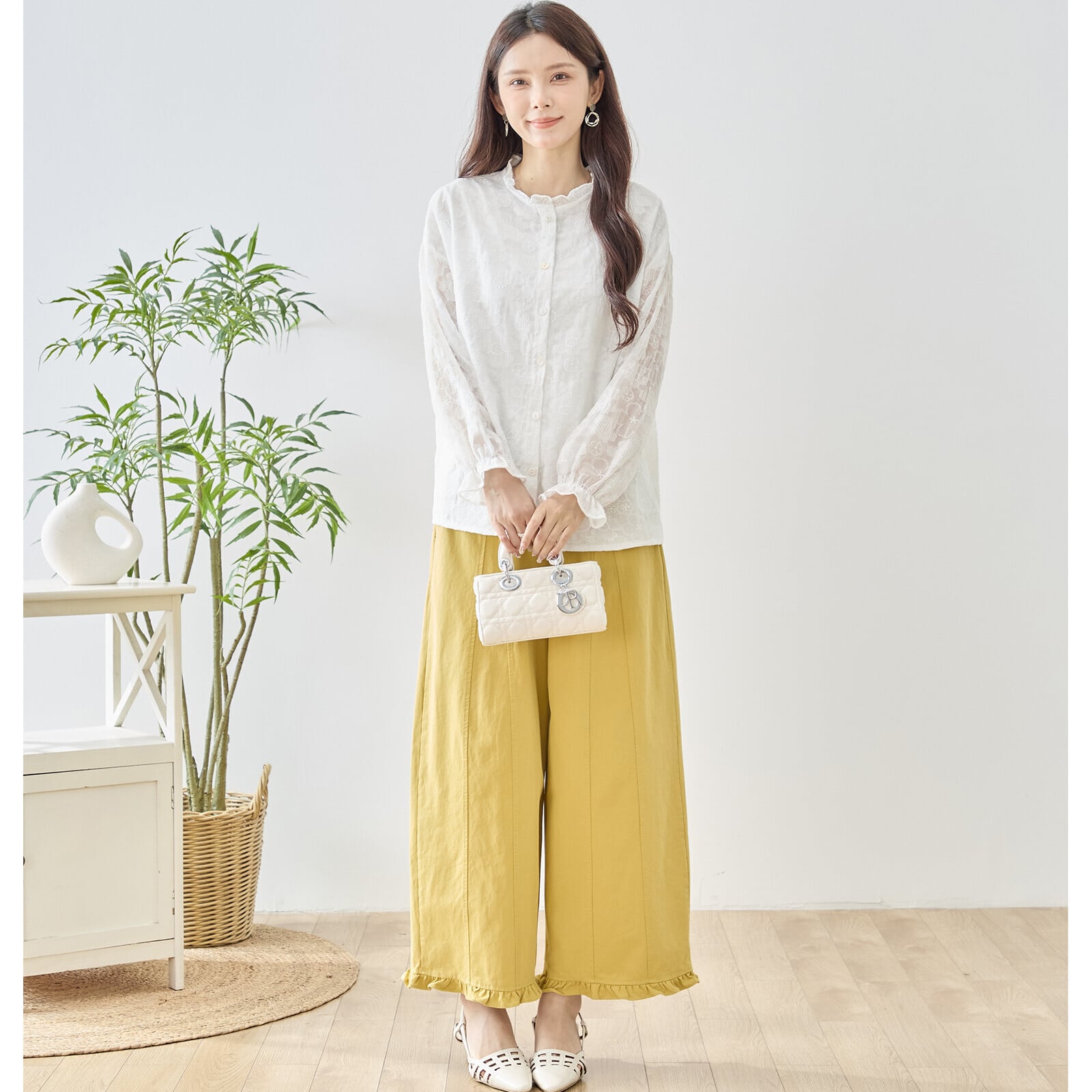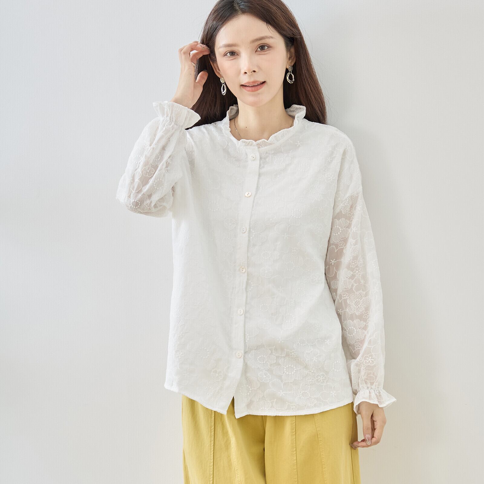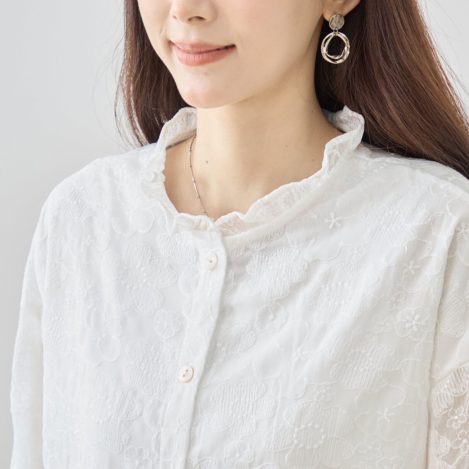 優雅でありながらもカジュアルさを忘れない、刺繍フリルスタンドカラーパフスリーブブラウスが登場しました!