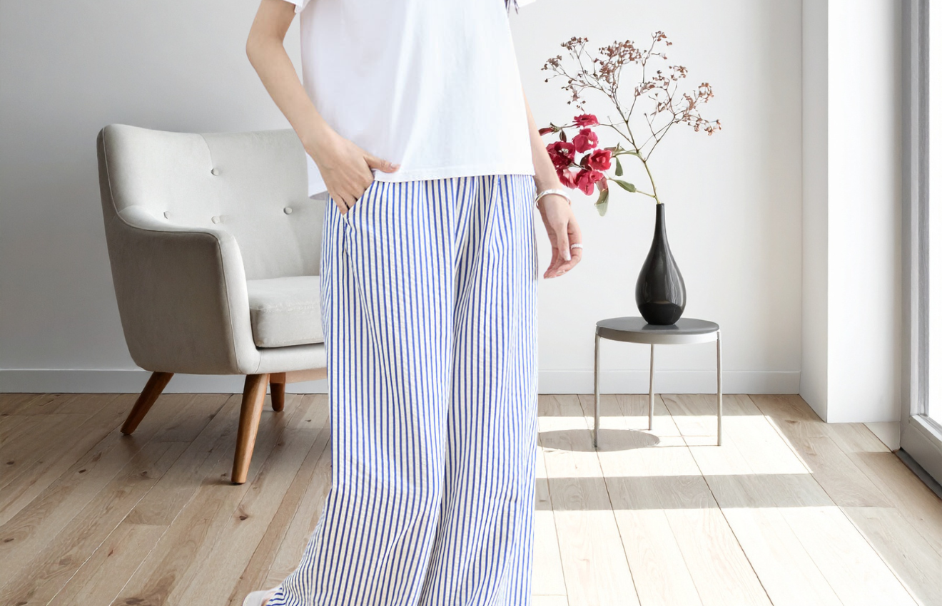 軽やかな素材感とストライプ柄が涼しげな印象を与える、