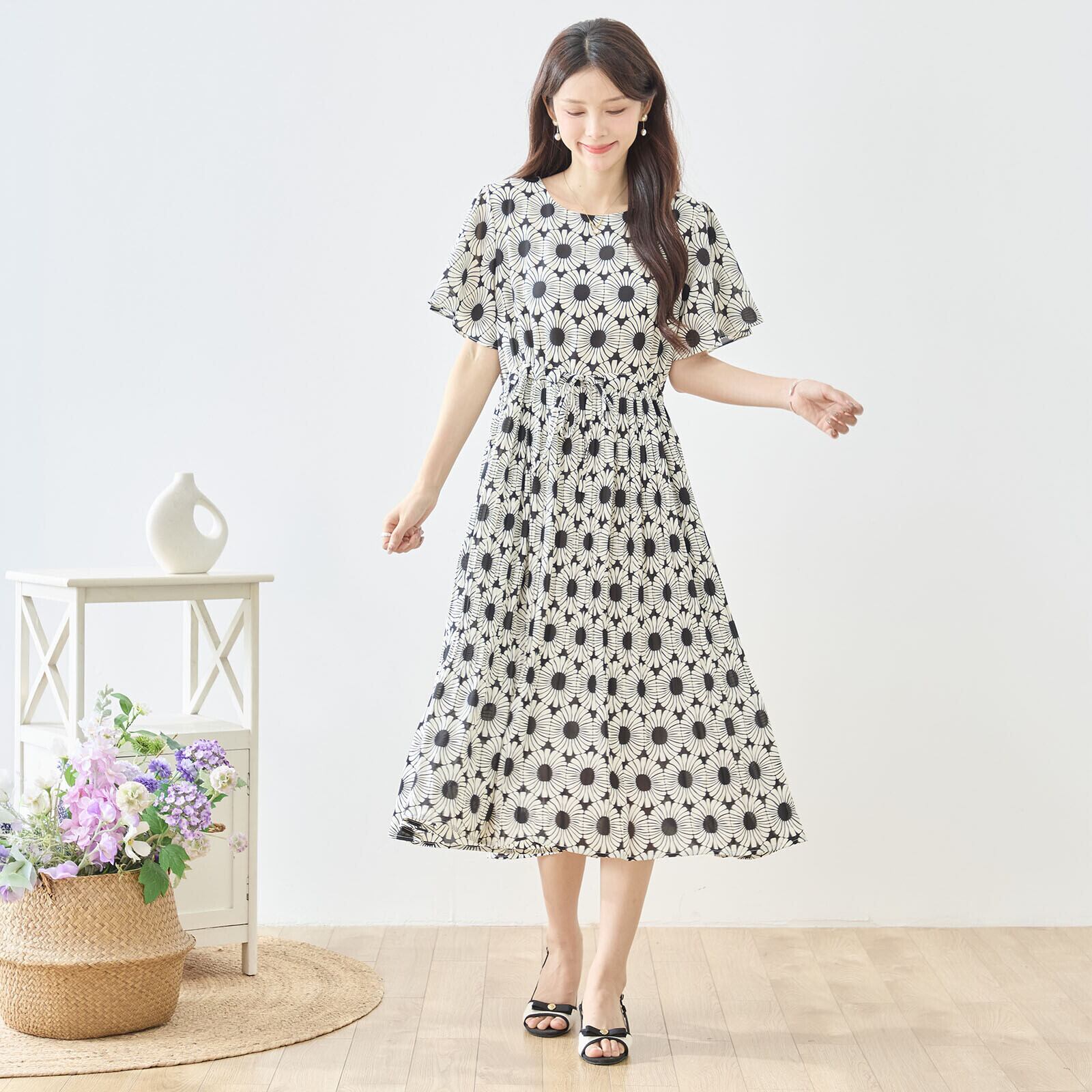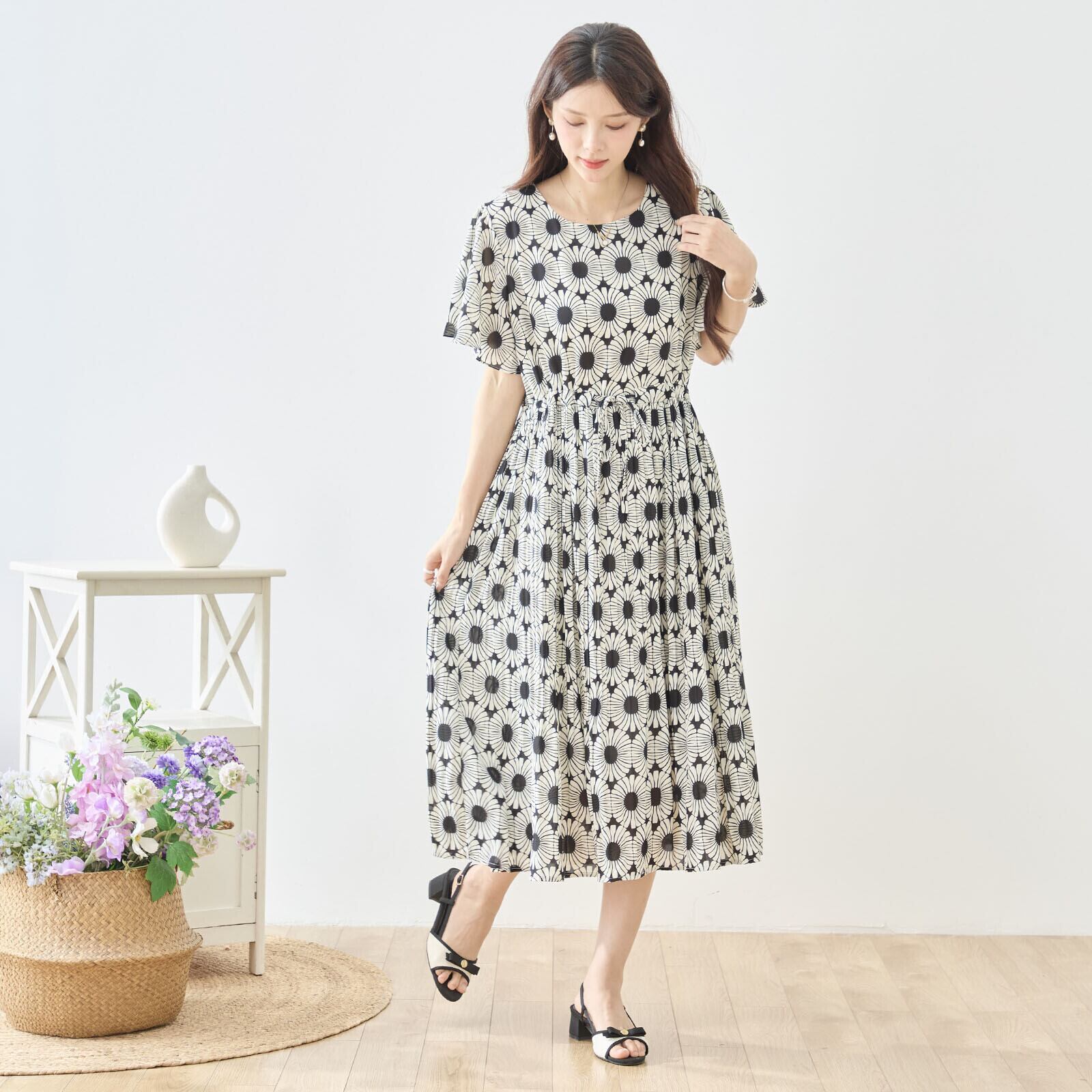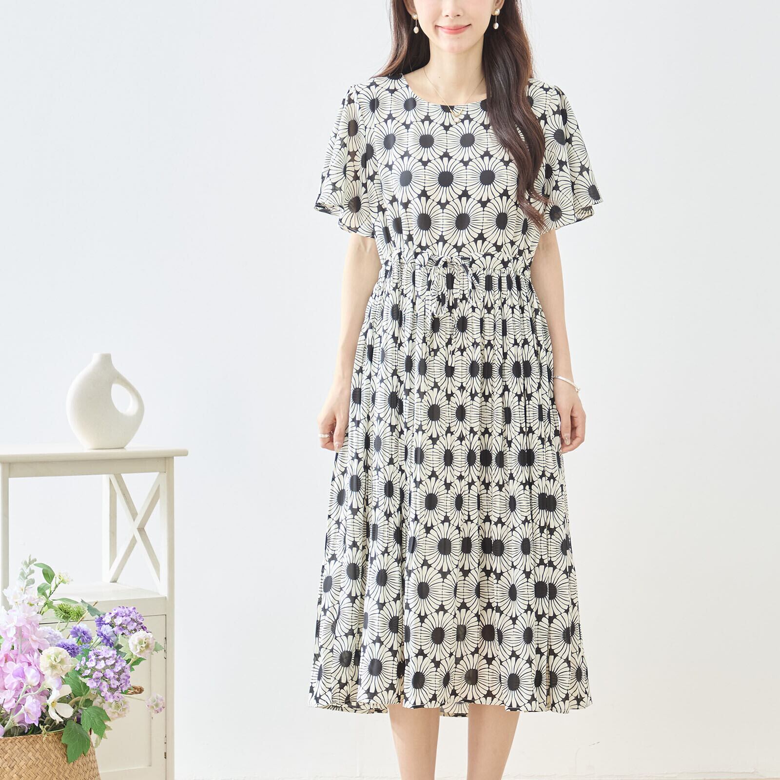 このジオメトリック総柄ウエストギャザーワンピースをあなたのワードローブに加えて、華やかな春夏のコーディネートを実現しましょう!