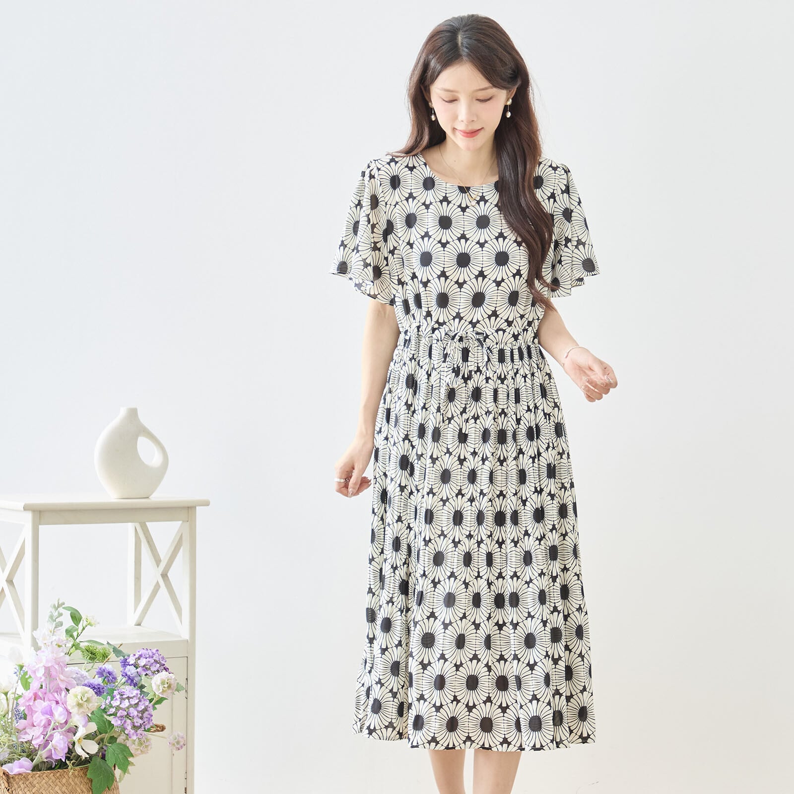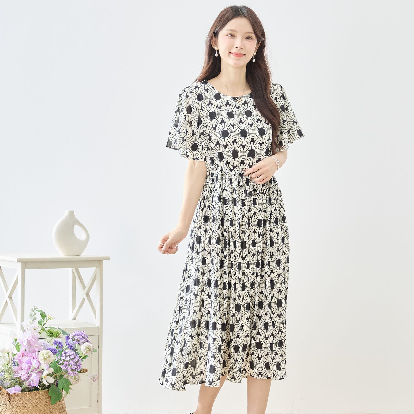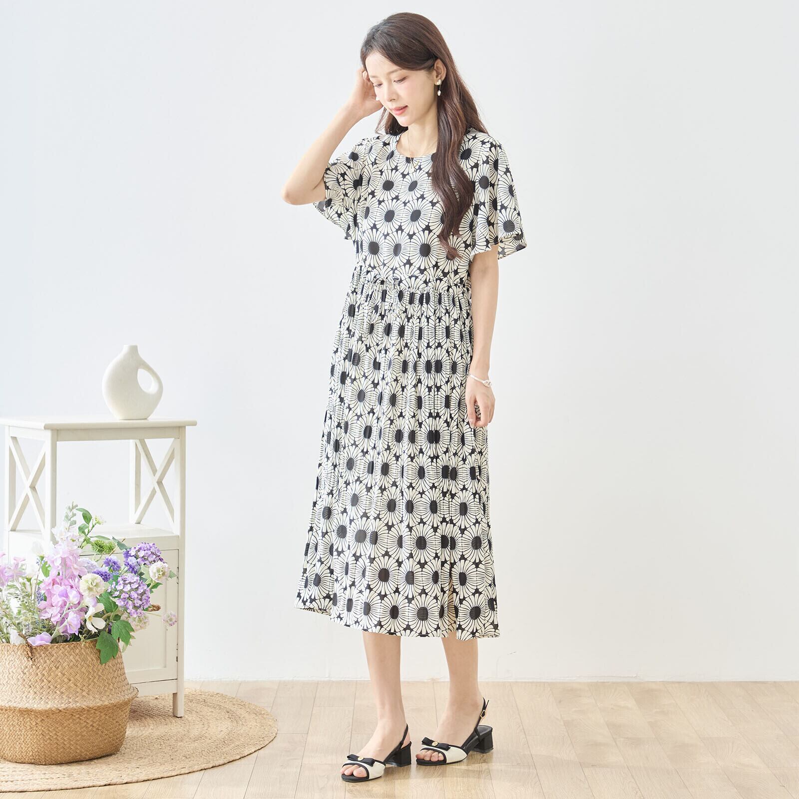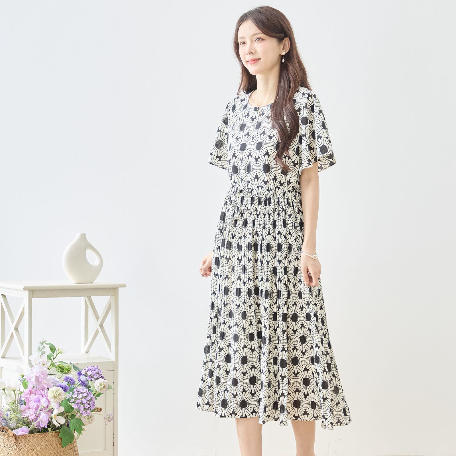 このジオメトリック総柄ウエストギャザーワンピースをあなたのワードローブに加えて、華やかな春夏のコーディネートを実現しましょう!