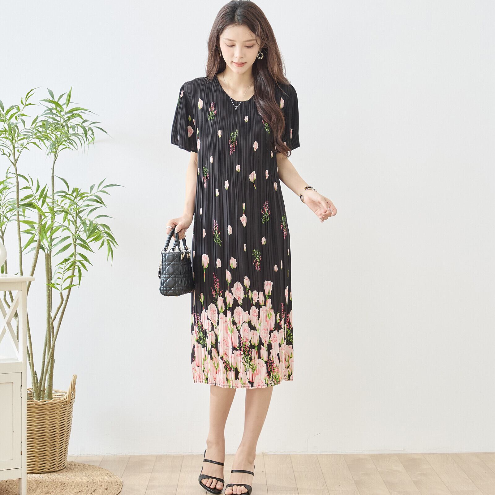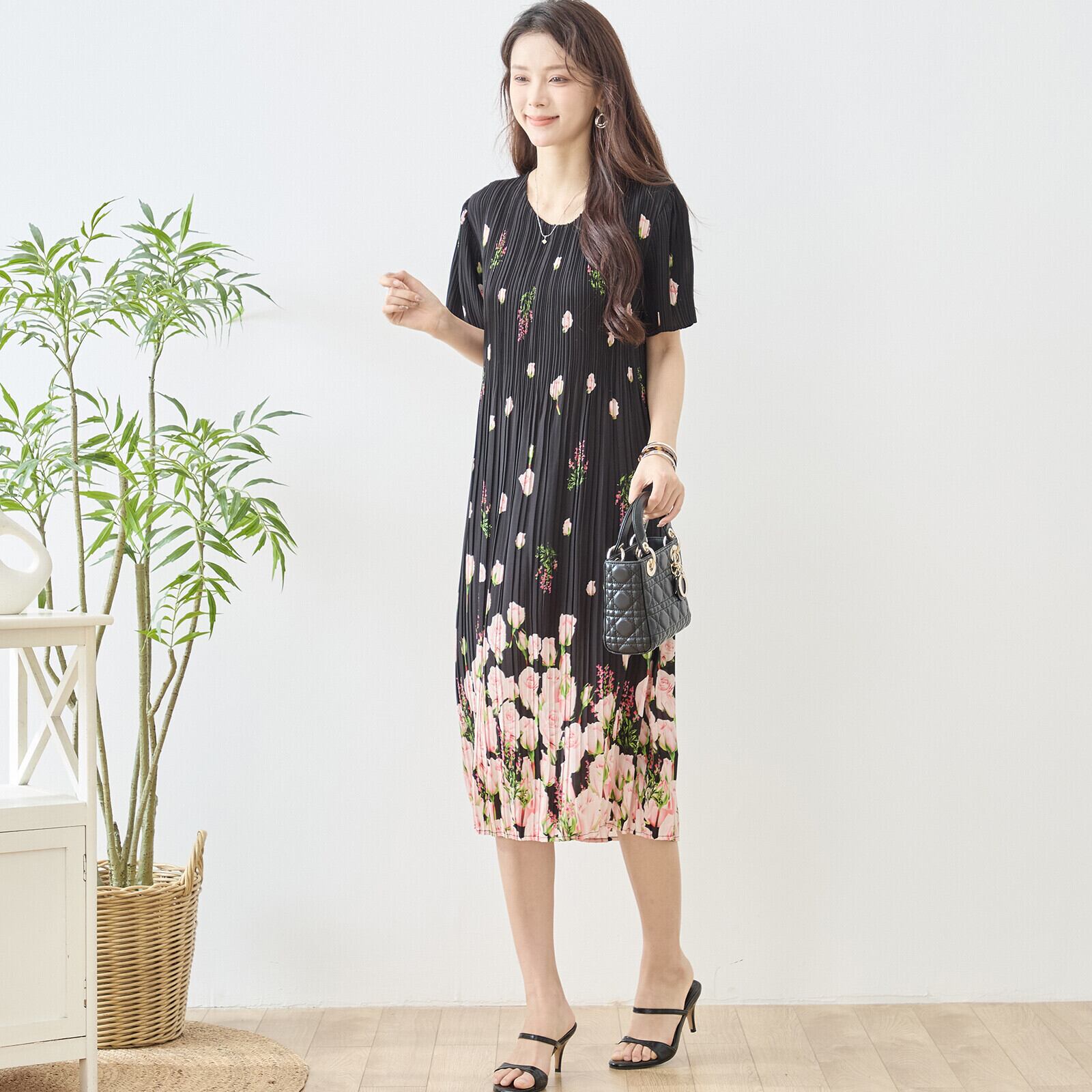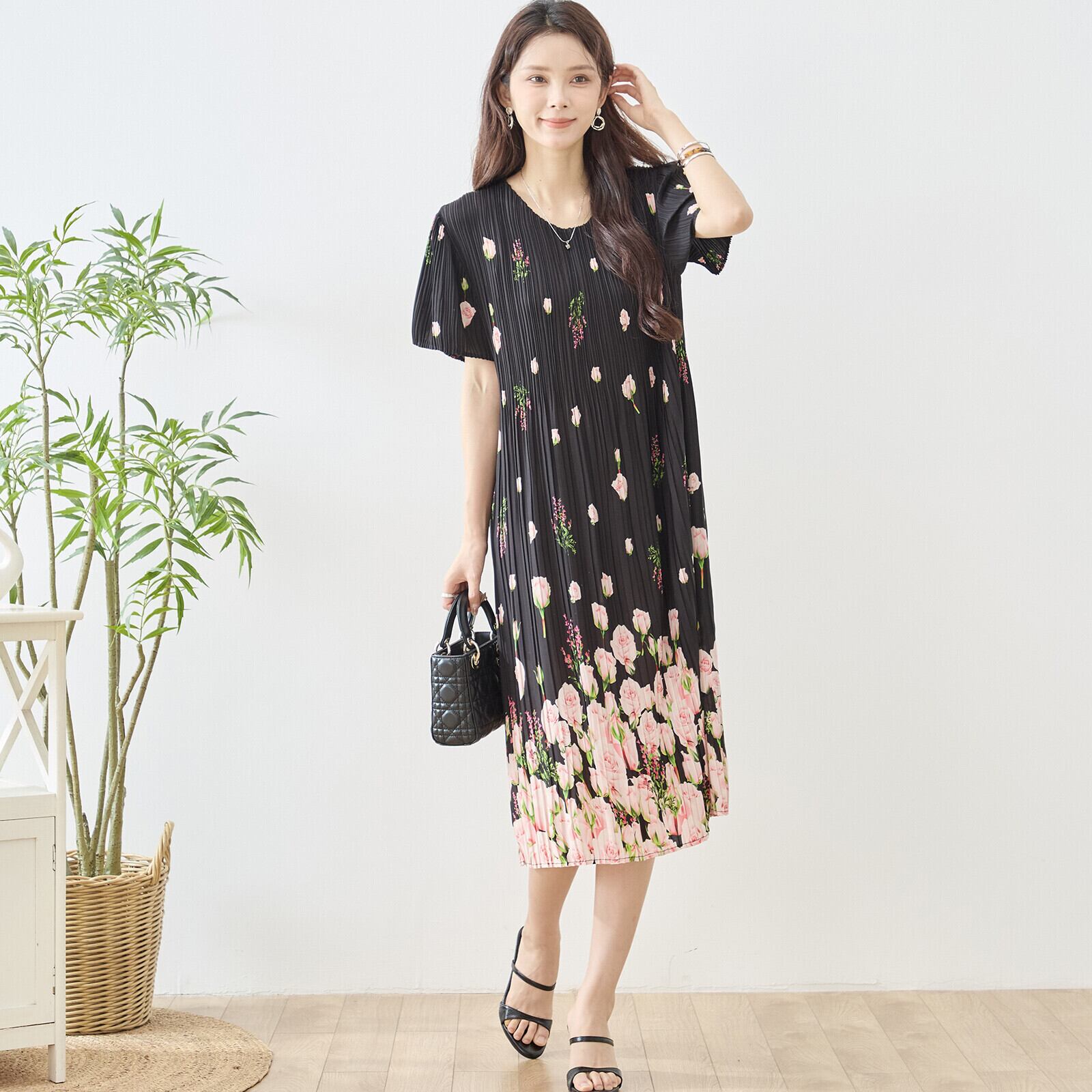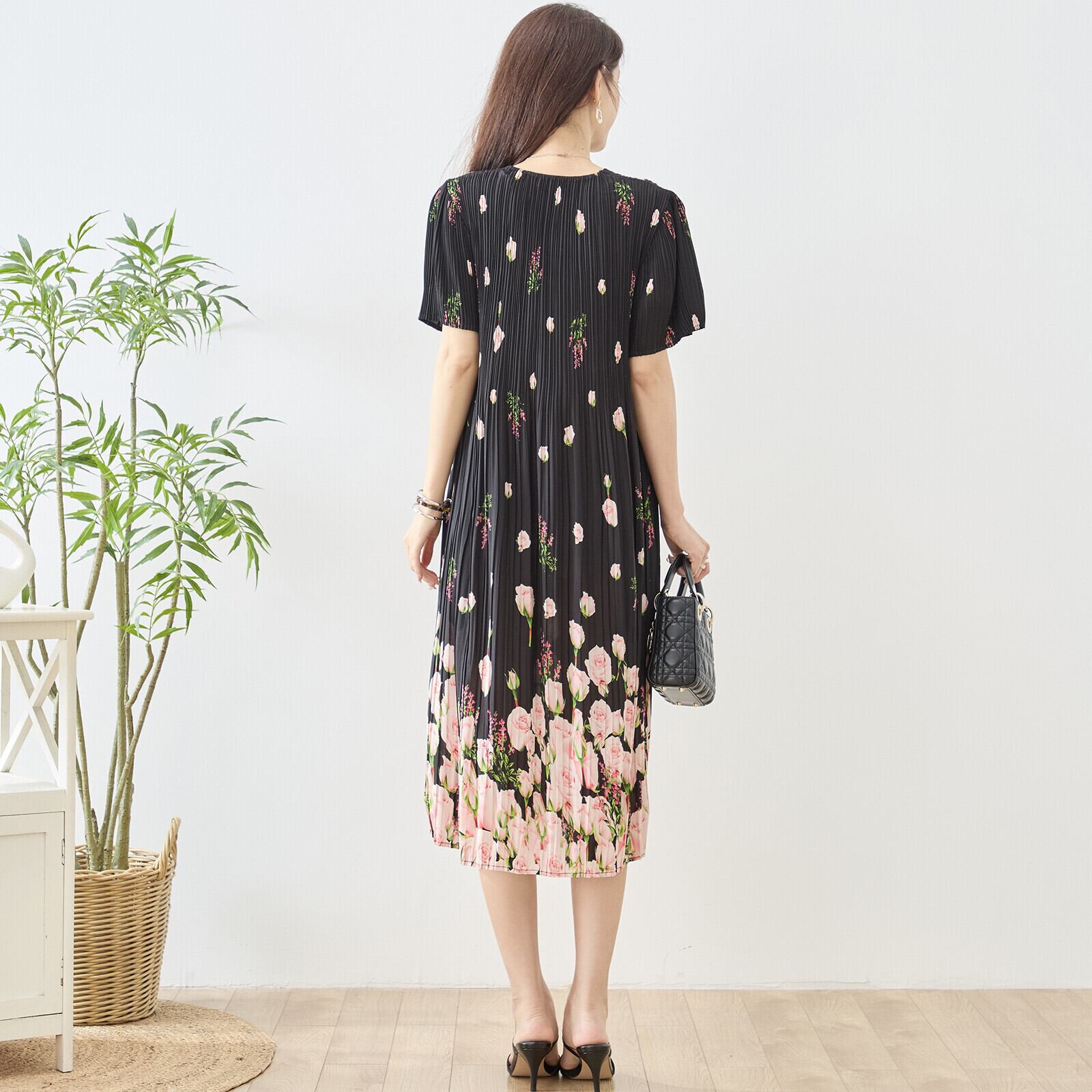 このバラ花柄プリントプリーツVネックワンピースをあなたのワードローブに加えて、華やかなコーディネートを作り上げましょう!