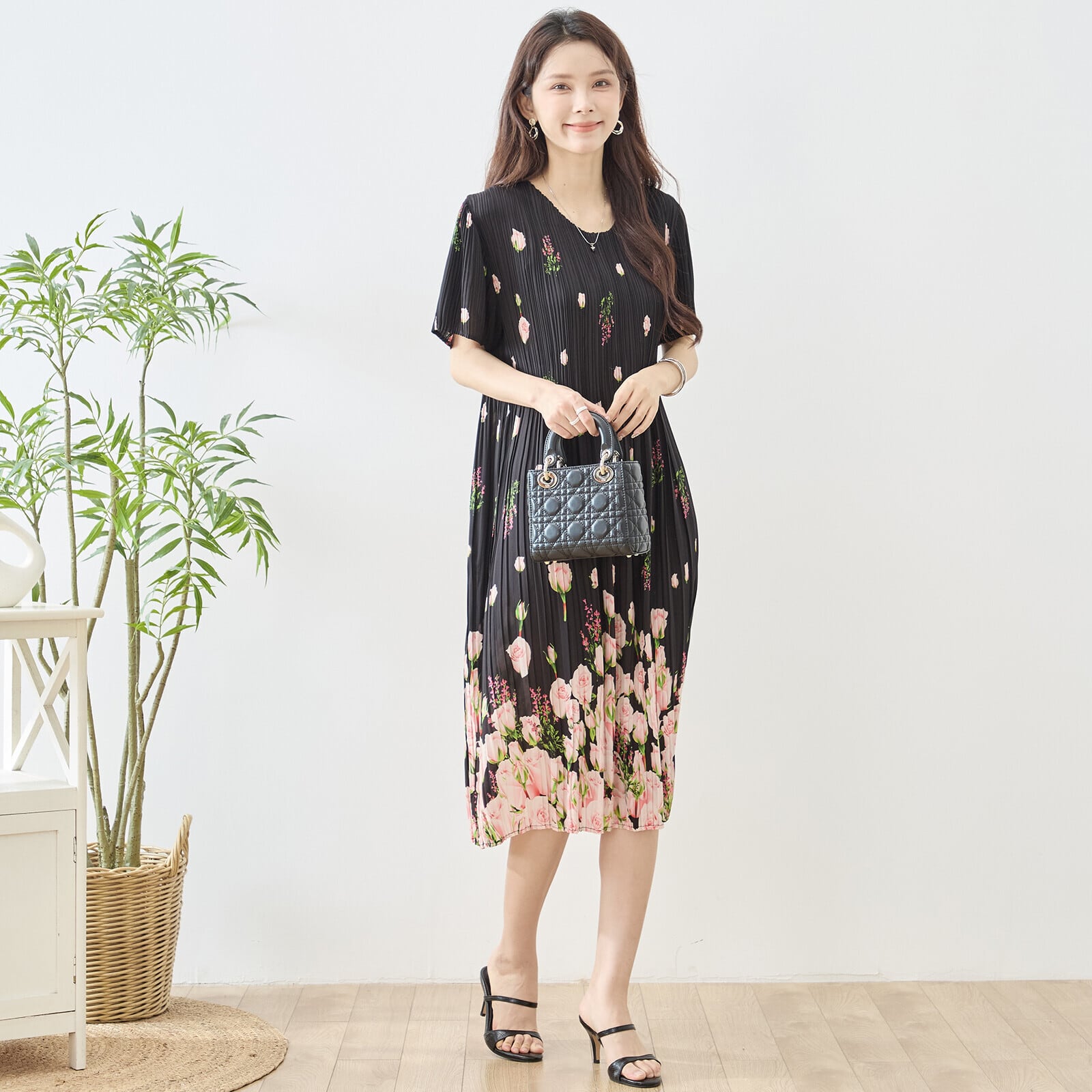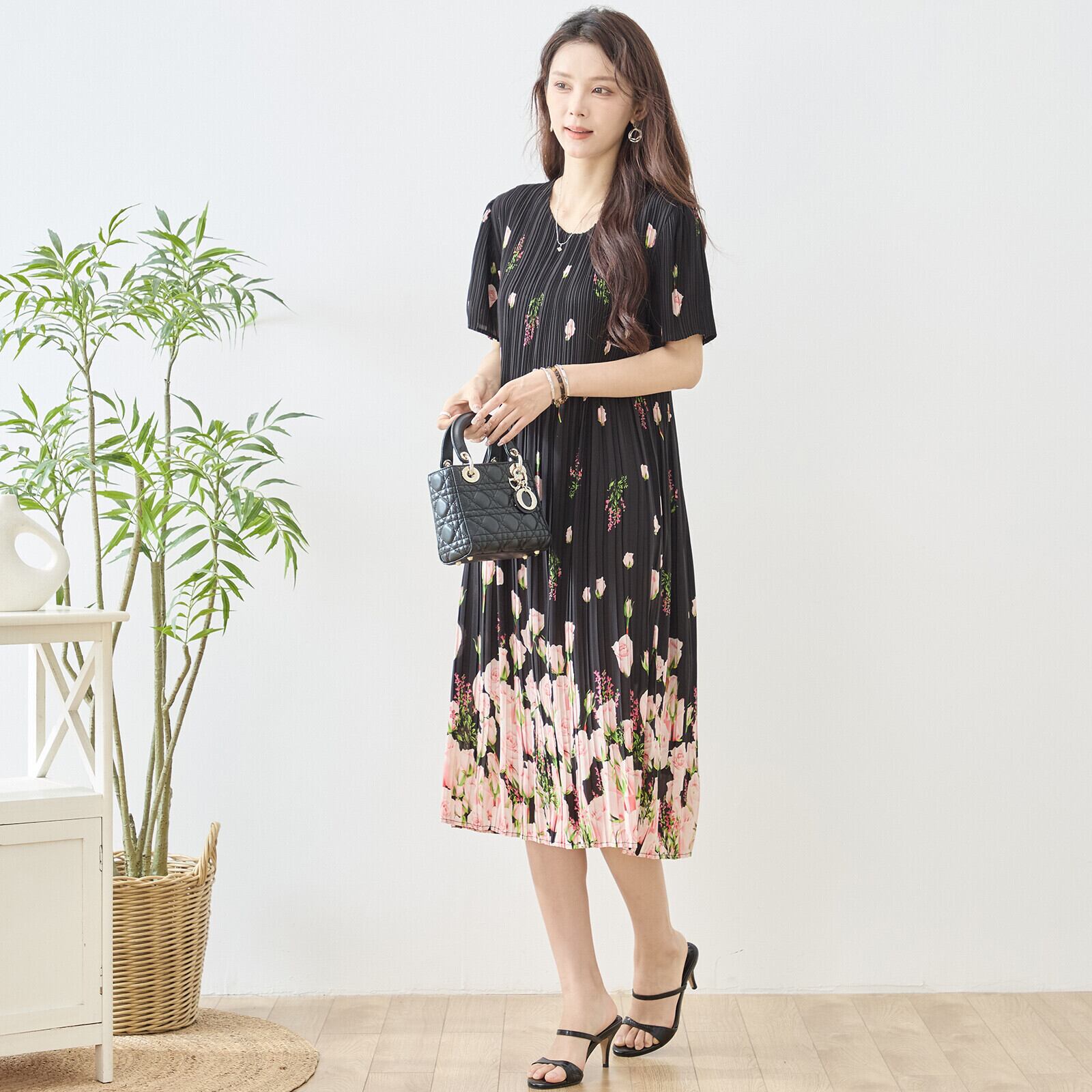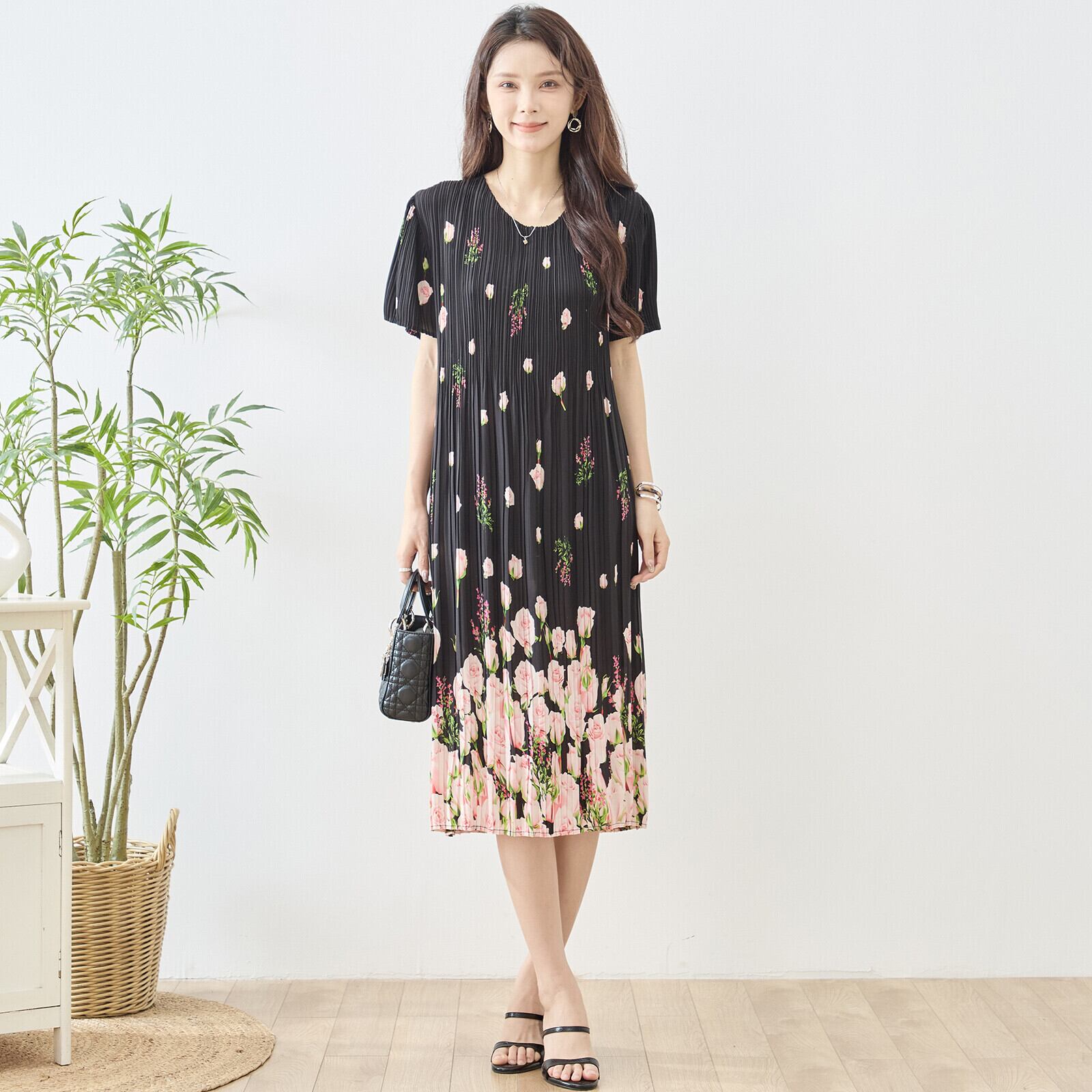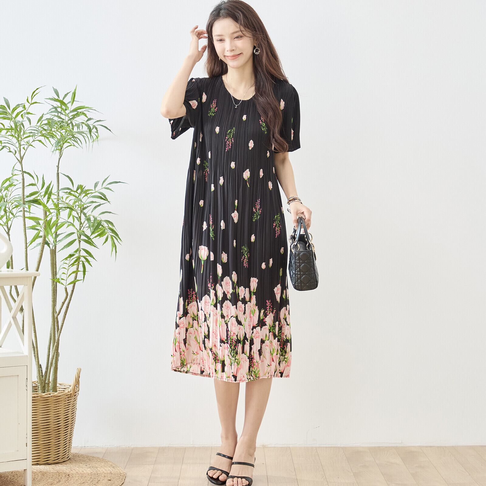このバラ花柄プリントプリーツVネックワンピースをあなたのワードローブに加えて、華やかなコーディネートを作り上げましょう!